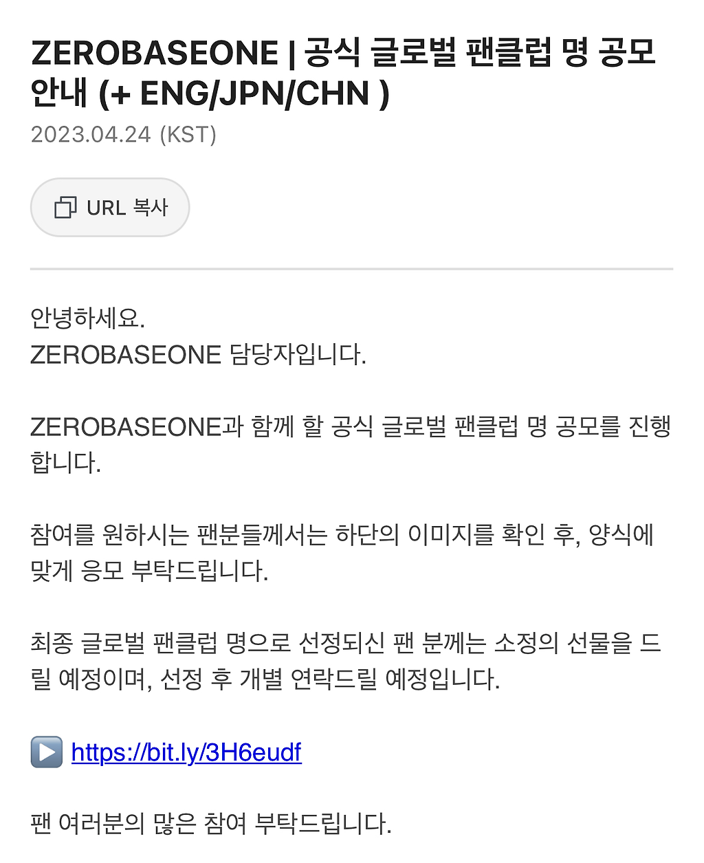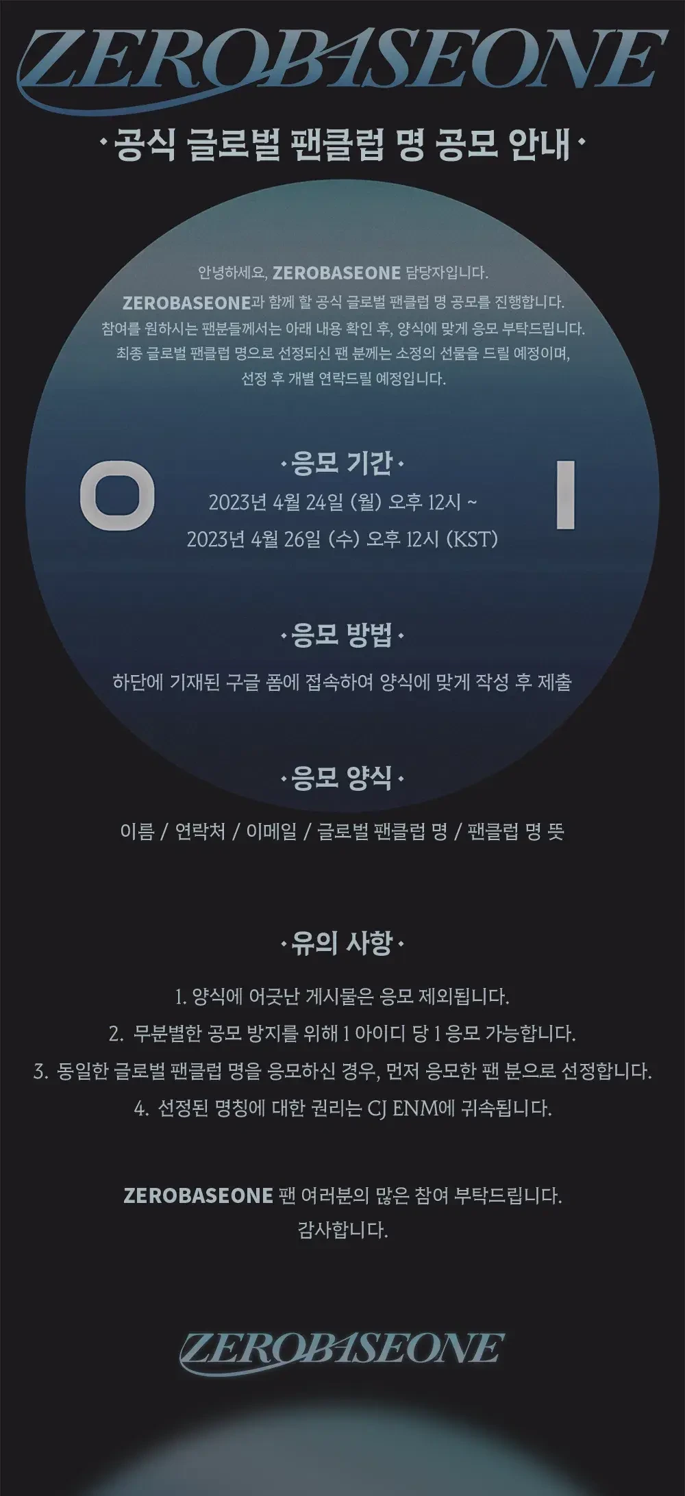 ZEROBASEONE | 공식 글로벌 팬클럽 명 공모 안내냥냠냥냠 참고로 제로 베이스 원 = 제베원도 팬 응모로 인해 지어진 이름 또 무슨 이상한 이름으로 팬덤명을 정할 지 벌써 무서운데요추천수0비추천등록된 샷 리스트팬클럽팬덤명응모공식안내댓글 4댓글 정렬방식 선택추천순선택됨작성순Loading...Loading...Loading...Loading...댓글 쓰기프로필만 있으면 누구나 댓글 작성이 가능합니다.Loading...Loading...Loading...Loading...Loading...