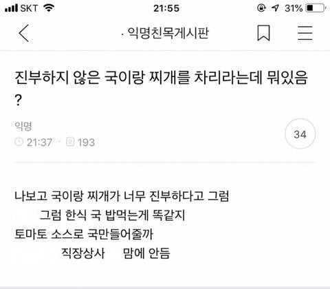 직장상사가 진부하지 않은 국이랑 찌개를 차리라는데 뭐있음?소인배추천수5비추천등록된 샷 리스트직장상사찌개댓글 1댓글 정렬방식 선택추천순선택됨작성순Loading...댓글 쓰기프로필만 있으면 누구나 댓글 작성이 가능합니다.Loading...Loading...Loading...Loading...Loading...