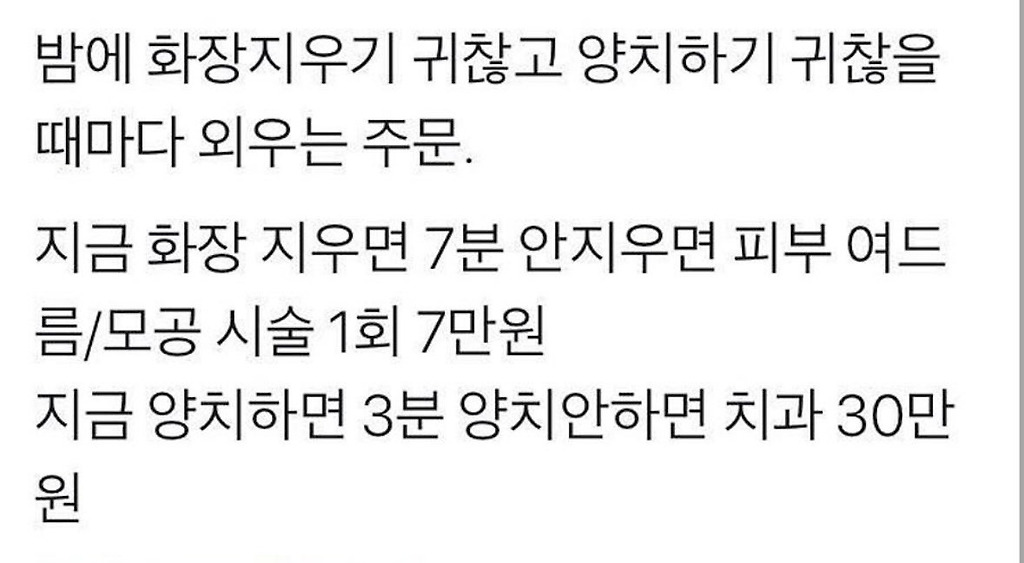 밤에 화장 지우기 귀찮고 양치하기 귀찮을 때마다 외우는 주문야임마누엘 칸트ㅊㅊ ㅇㅅㅌㅈ추천수5비추천등록된 샷 리스트양치화장밤댓글 0댓글 정렬방식 선택추천순선택됨작성순댓글 쓰기프로필만 있으면 누구나 댓글 작성이 가능합니다.Loading...Loading...Loading...Loading...Loading...