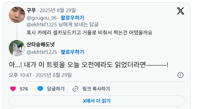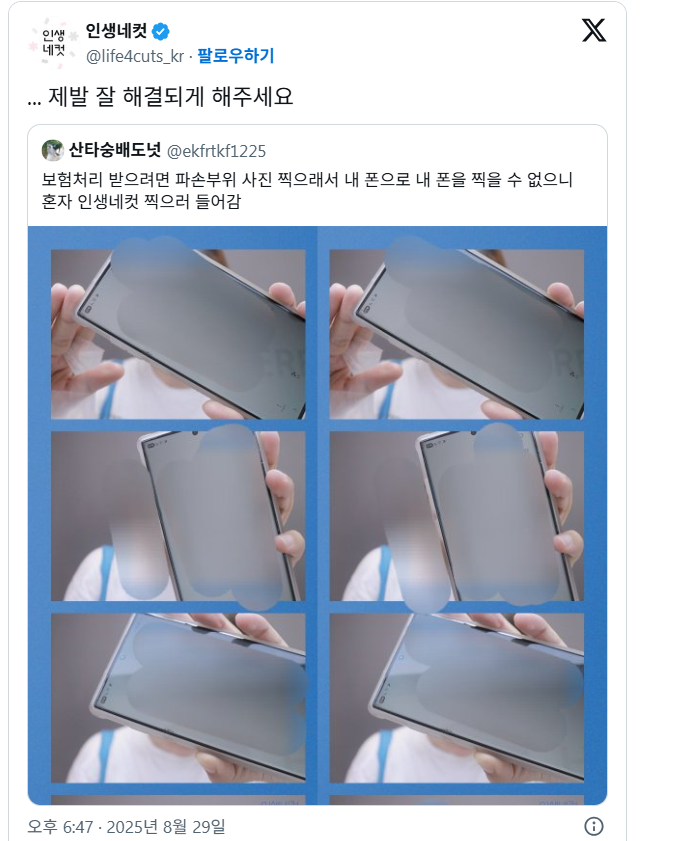 핸드폰 들고 인생네컷 찍은 이유소인배추천수1비추천댓글 1댓글 정렬방식 선택추천순선택됨작성순Loading...댓글 쓰기프로필만 있으면 누구나 댓글 작성이 가능합니다.Loading...Loading...Loading...Loading...Loading...