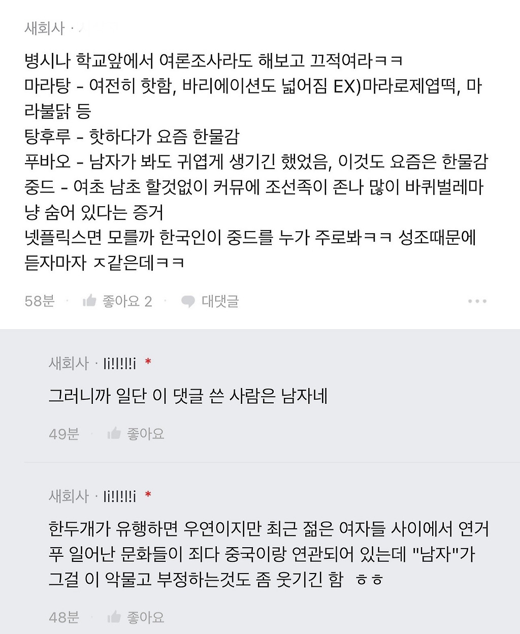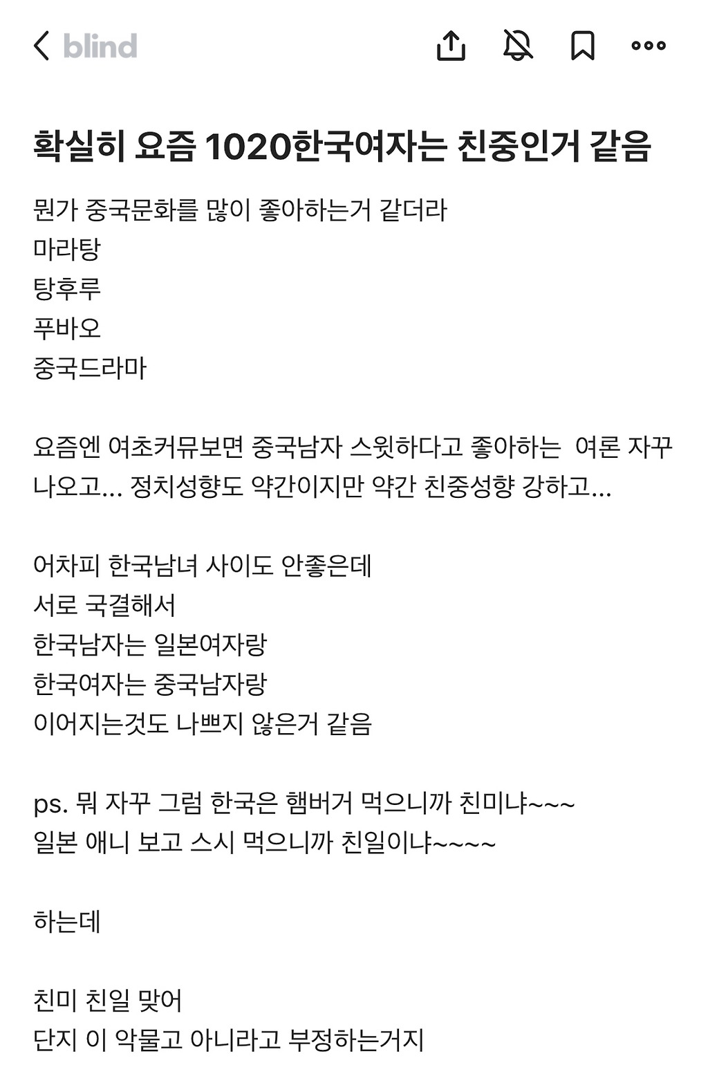 확실히 요즘 1020 한국여자는 친중인거 같음.blind00001 추천수3비추천등록된 샷 리스트친중BLIND여자댓글 4댓글 정렬방식 선택추천순선택됨작성순Loading...Loading...Loading...Loading...댓글 쓰기프로필만 있으면 누구나 댓글 작성이 가능합니다.Loading...Loading...Loading...Loading...Loading...