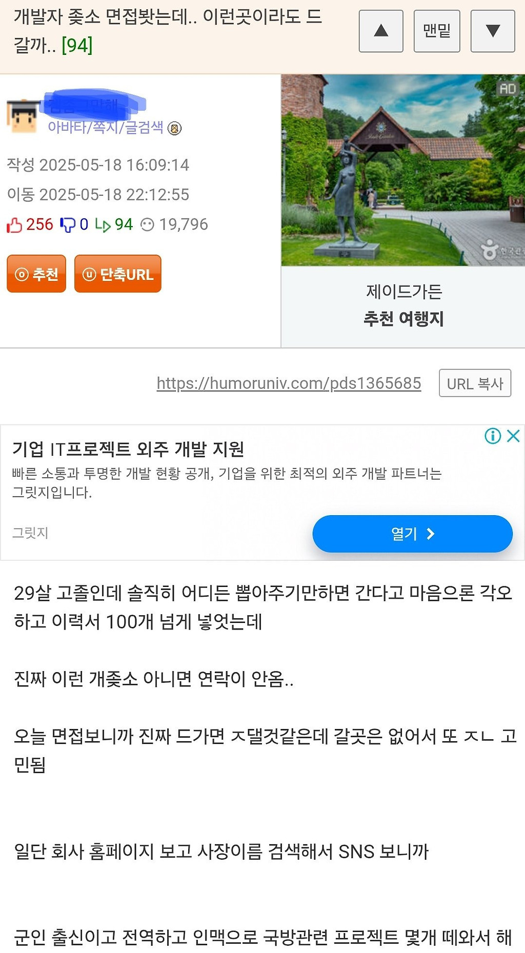 AI로 검색해가며 개발하면 된다는 좆소 면접no name 뭘 물어봐 도망쳐!추천수2비추천등록된 샷 리스트면접검색도망댓글 0댓글 정렬방식 선택추천순선택됨작성순댓글 쓰기프로필만 있으면 누구나 댓글 작성이 가능합니다.Loading...Loading...Loading...Loading...Loading...