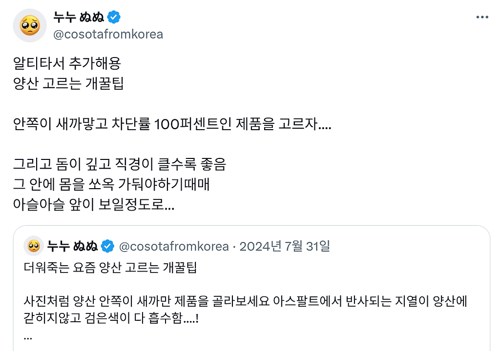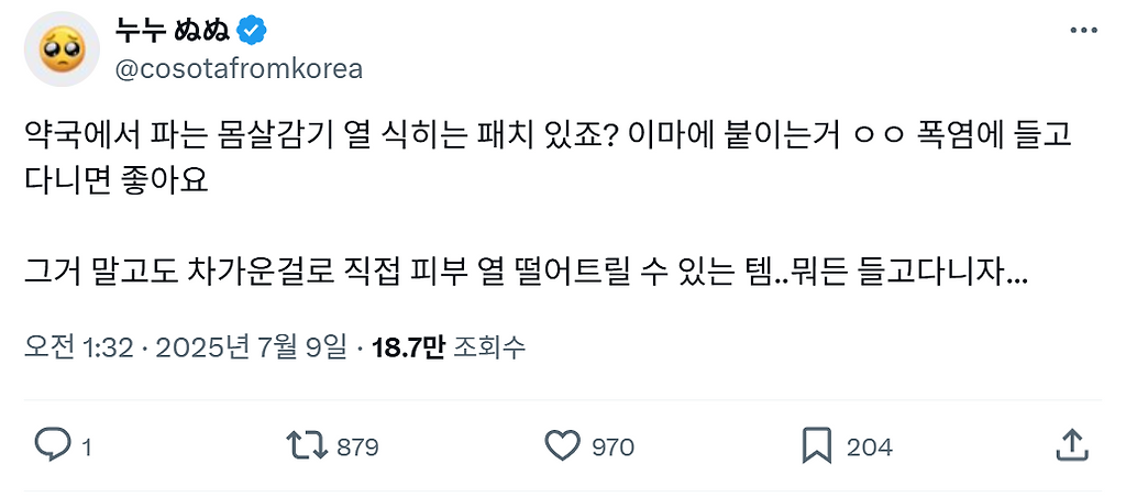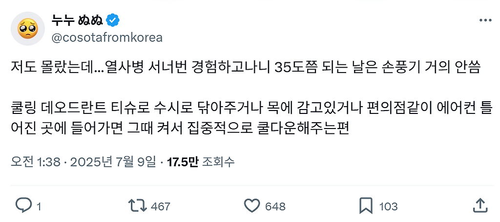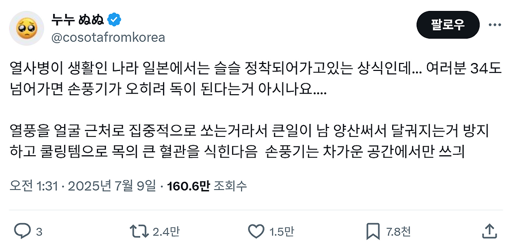 여러분 34도 넘어가면 손풍기가 오히려 독이 된다는거 아시나요냥냠냥냠ㅊㅊ https://x.com/cosotafromkorea/status/1942622614922617134 추천수4비추천등록된 샷 리스트34도독손풍기댓글 0댓글 정렬방식 선택추천순선택됨작성순댓글 쓰기프로필만 있으면 누구나 댓글 작성이 가능합니다.Loading...Loading...Loading...Loading...Loading...