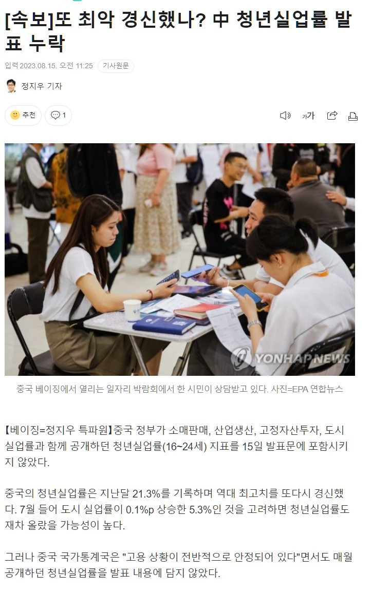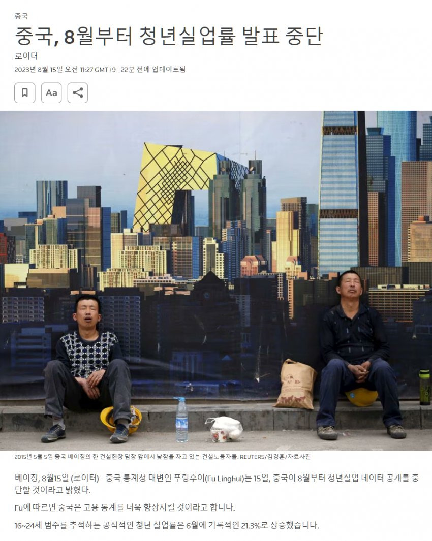 중국, 8월부터 청년실업률 발표 중단소인배이미 코로나 통계를 조작한 전례가 있다보니이번 건은 도저히 통계 조작으로도 덮기 어려울 것이라고 판단해 중단시키는 것으로 전문가들이 추정 중추천수0비추천등록된 샷 리스트청년실업률통계조작중단중국댓글 2댓글 정렬방식 선택추천순선택됨작성순Loading...Loading...댓글 쓰기프로필만 있으면 누구나 댓글 작성이 가능합니다.Loading...Loading...Loading...Loading...Loading...