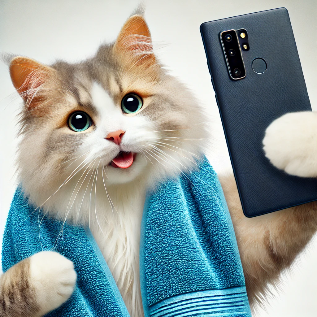 photo of a cheerful Angora cat taking a selfie, with a blue towel wrapped around the middle of its body, showing the full field of view of the cat and the towel, 4k resolution, realistic white background
