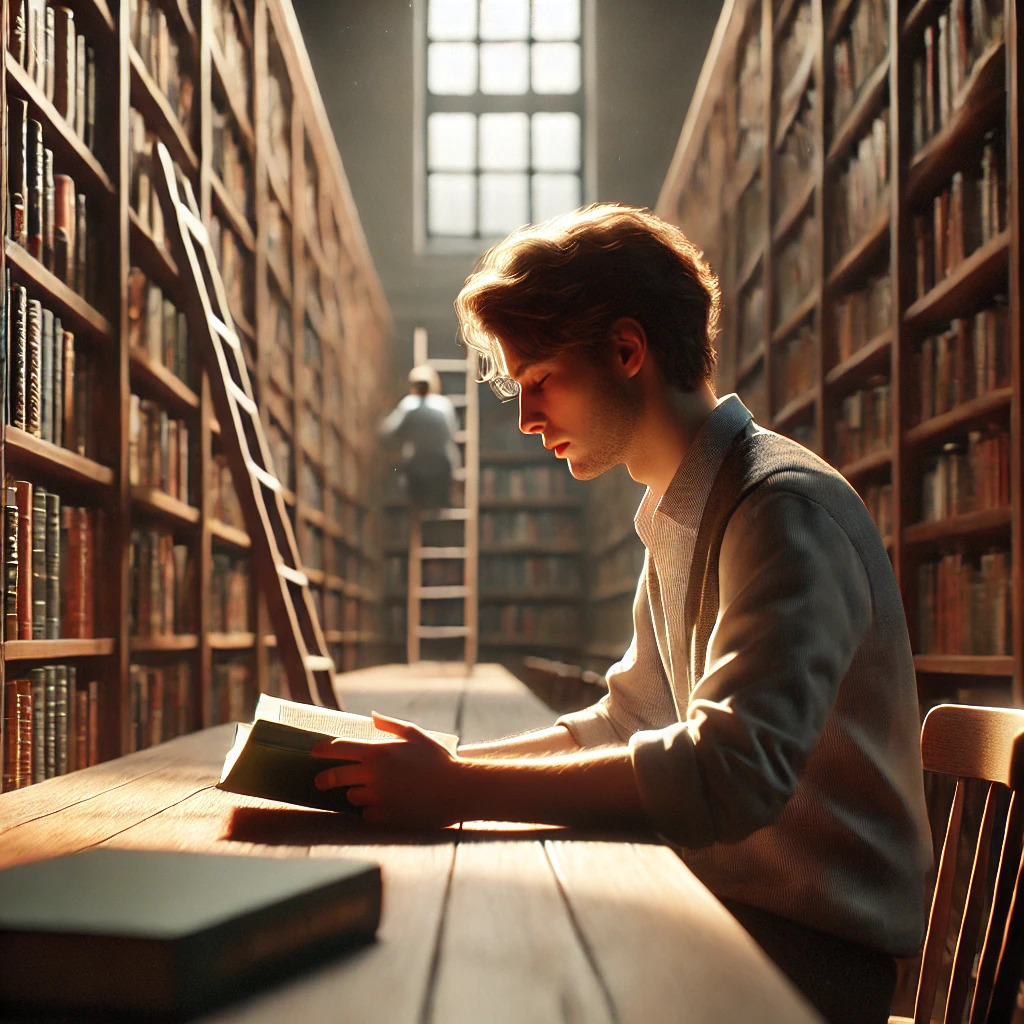 prompt: A realistic image of a person reading a book in a library. The person is sitting at a wooden table, surrounded by shelves filled with books. The lighting is warm and soft, creating a cozy atmosphere. The person is deeply engrossed in the book, with a focused expression. The background includes rows of bookshelves, some with ladders for reaching higher shelves. The overall mood is calm and studious, capturing the quiet and peaceful environment of a library.