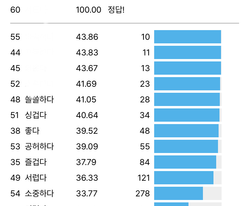 오늘도 꼬맨틀! (+힌트)소인배539번째 꼬맨틀을 풀었습니다!추측 횟수: 60소요 시간: 00시간08분32초최대 유사도: 43.86 (순위 10)https://semantle-ko.newsjel.ly/꼬맨틀 - 단어 유사도 추측 게임 - 뉴스젤리 : 데이터 시각화 전문 기업하루에 한 번, 오늘의 단어를 맞혀보세요. 단어를 입력하면 정답 단어와의 유사도를 보여줍니다.semantle-ko.newsjel.ly힌트 : 3글자!!추천수0비추천등록된 샷 리스트유사도힌트글자댓글 0댓글 정렬방식 선택추천순선택됨작성순댓글 쓰기프로필만 있으면 누구나 댓글 작성이 가능합니다.Loading...Loading...Loading...Loading...Loading...