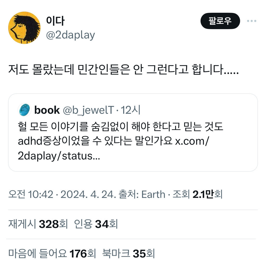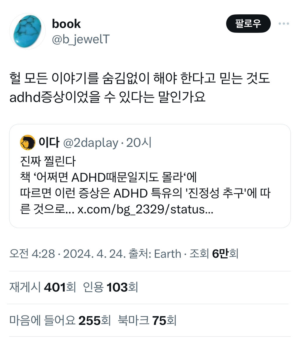 생각지도 못한 ADHD 증상중하나또리비니 ㅊㅊ -ㄷㅅㄱ추천수11비추천등록된 샷 리스트ADHD증상생각댓글 1댓글 정렬방식 선택추천순선택됨작성순Loading...댓글 쓰기프로필만 있으면 누구나 댓글 작성이 가능합니다.Loading...Loading...Loading...Loading...Loading...