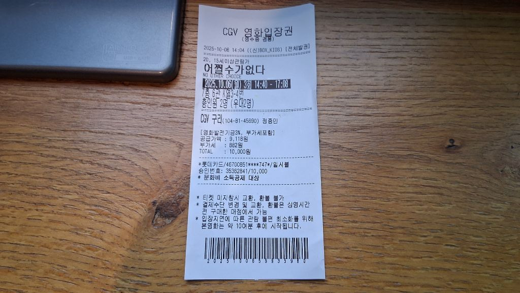 2025년 10월 6일 cgv 구리김동균2025년 10월 6일오늘은 엄마랑 cgv 구리에 가서 영화 어쩔수가 없다를 관람하였습니다.팝콘 스몰세트통오징어 구이추천수0비추천등록된 샷 리스트CGV2025년_10월구리댓글 0댓글 정렬방식 선택추천순선택됨작성순댓글 쓰기프로필만 있으면 누구나 댓글 작성이 가능합니다.Loading...Loading...Loading...Loading...Loading...