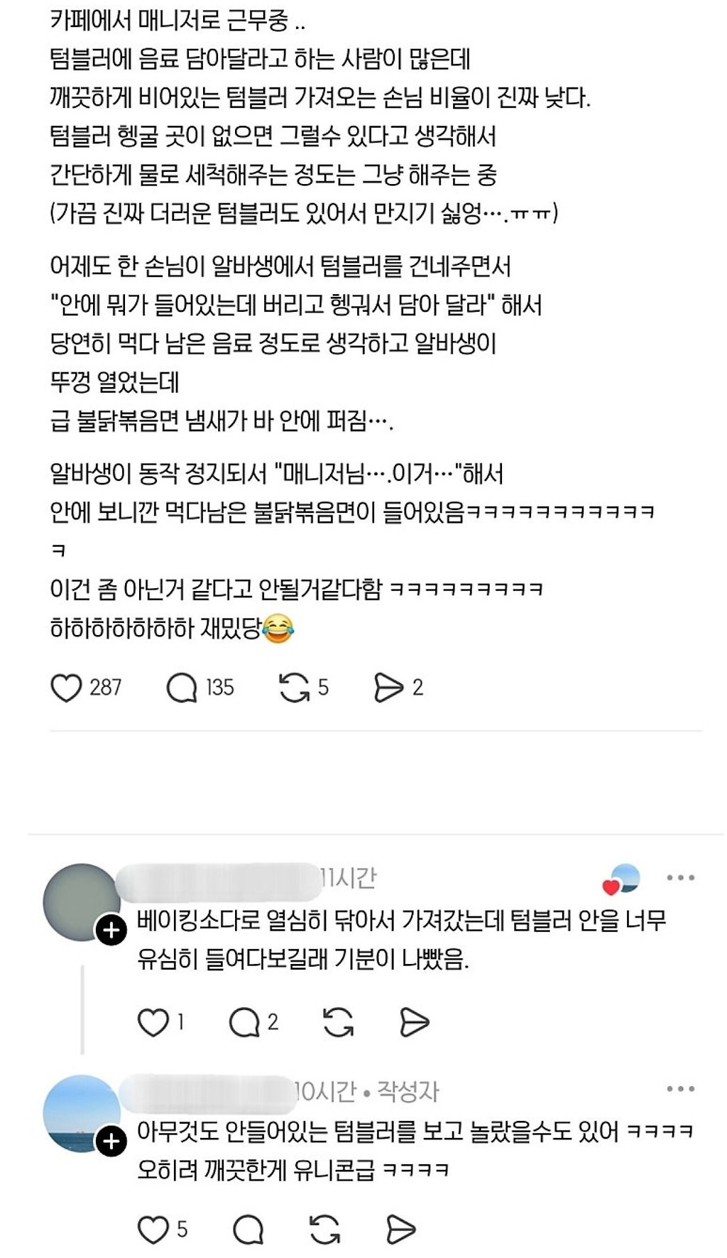 텀블러 안을 보고 놀란 카페 알바00001추천수2비추천댓글 3댓글 정렬방식 선택추천순선택됨작성순Loading...Loading...Loading...댓글 쓰기프로필만 있으면 누구나 댓글 작성이 가능합니다.Loading...Loading...Loading...Loading...Loading...