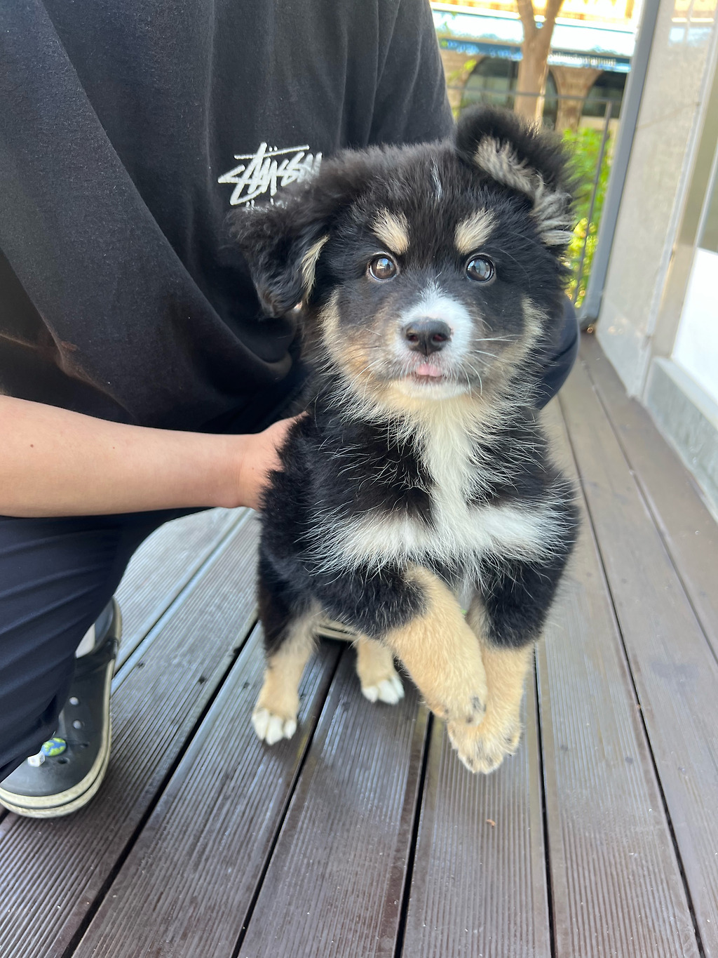 색상은 다양하지만, 전형적인 **삼색 패턴(검정·갈색·흰색)**이 많이 나타나며, 단색·이중색·브린들·사블 등도 가능합니다.