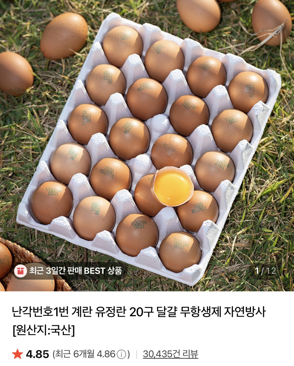 핫딜! 난각번호1번 계란 유정란 20구 달걀 무항생제 자연방사 국산 5320원 무료배송!